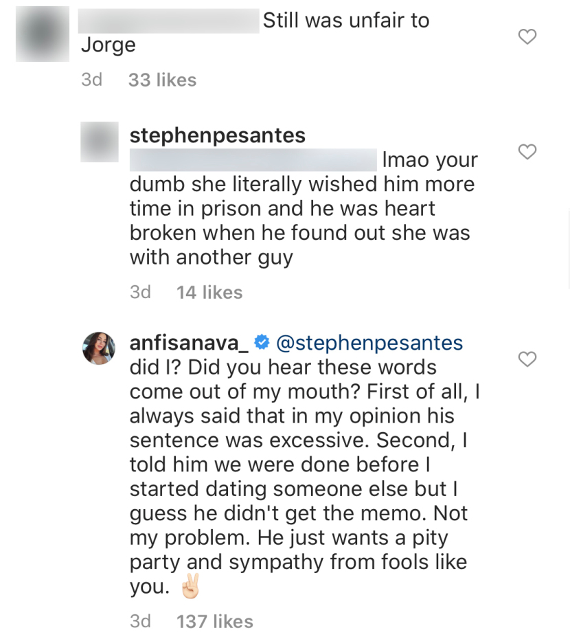 According to a troll, Anfisa wanted Jorge’s prison time extended. The hater believes that she broke Jorge’s heart when he found out that Anfisa was with another man. But Anfisa made it clear that she parted ways with Jorge before moving on to dating other men. However, the story doesn’t see eye to eye with that of her estranged husband.