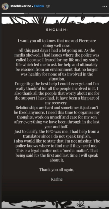 She is thankful to those who have been worrying about her and said that it was a hard time and she needs some space to deal with all of this. She also clarified that the EPO was her. Karine took some help from a translator. Last, but not the lease, Karine specified that this is not a media matter. The cops can find her when they need to.
