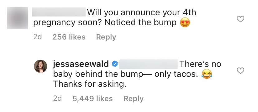 In the recent Instagram post, where Jessa shared a picture of herself with son Henry, a fan asked if she would announce her pregnancy. This followed her slightly visible bump. To this, Jessa replied that there is no baby but Tacos behind the bump. She signed off, thanking the follower for the asking.