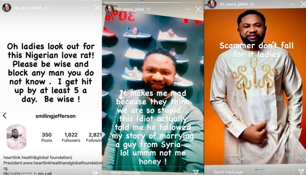 Laura claims that she gets hit up by at least five scammers in a single day. Posting a screencap of a Nigerian man’s profile, Laura cautioned women to look out for that particular Nigerian love rat. She urged them to be wise and block men they don’t know.