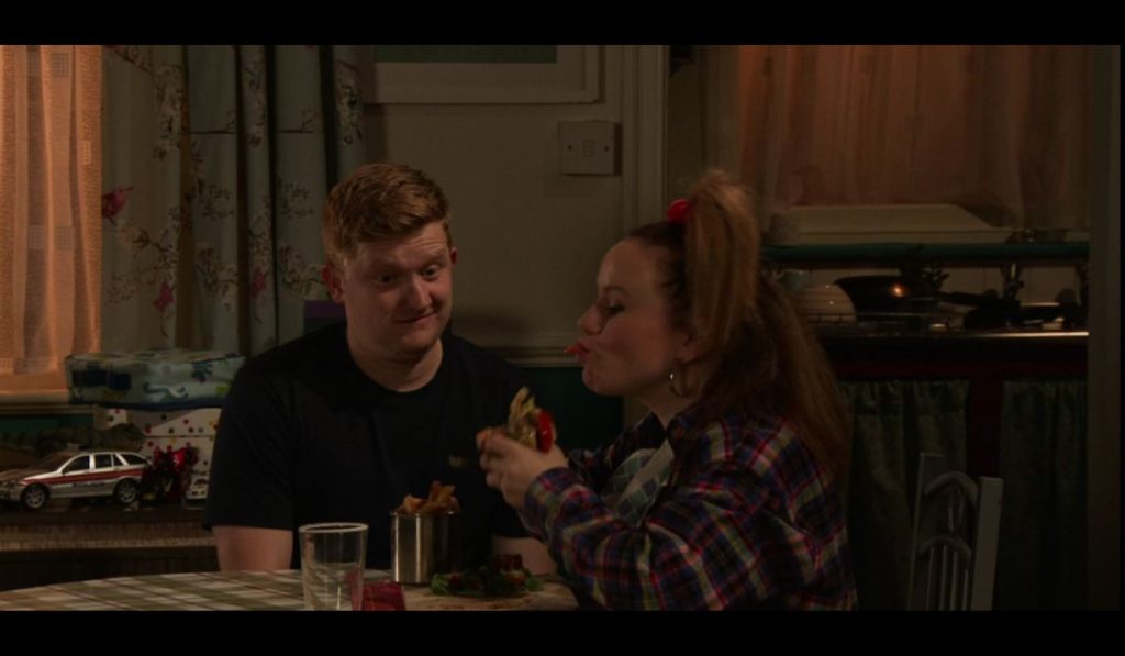 Gemma and Chesney are worried when she can’t get hold of Paul on Coronation Street. They venture out to look for him as they fear that he may have taken a fall. However, in reality, Paul and Billy settle down for a calm Christmas Day over a movie and something to drink at Builder’s yard flat. Meanwhile, at Chesney and Gemma’s Bernie video calls the family for Christmas from prison. They together sing “Away in Manger” to celebrate.