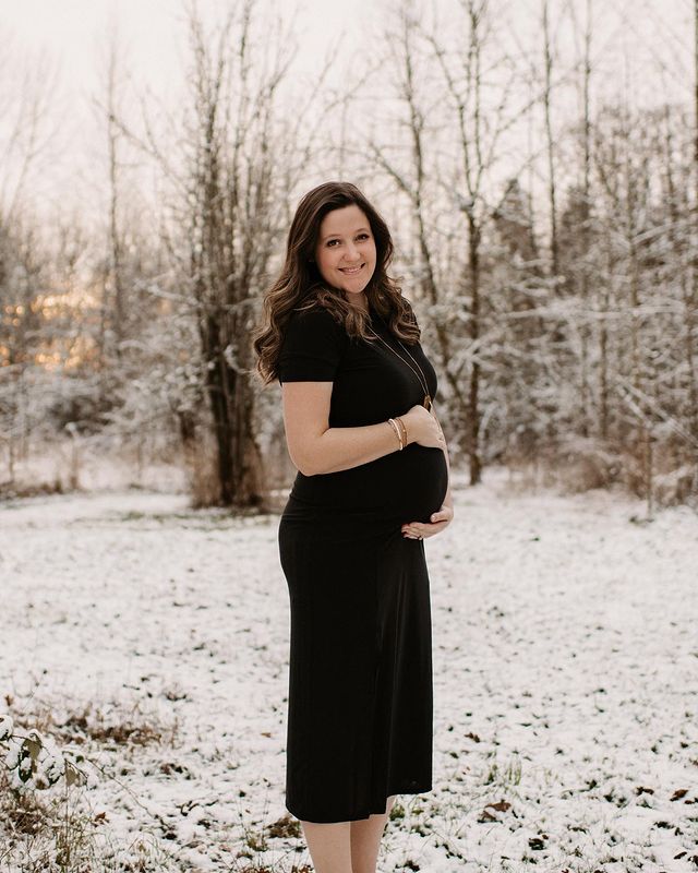 Tori Roloff smiles amidst beautiful snowy background. She gingerly holds her soon-to-come child within her belly.