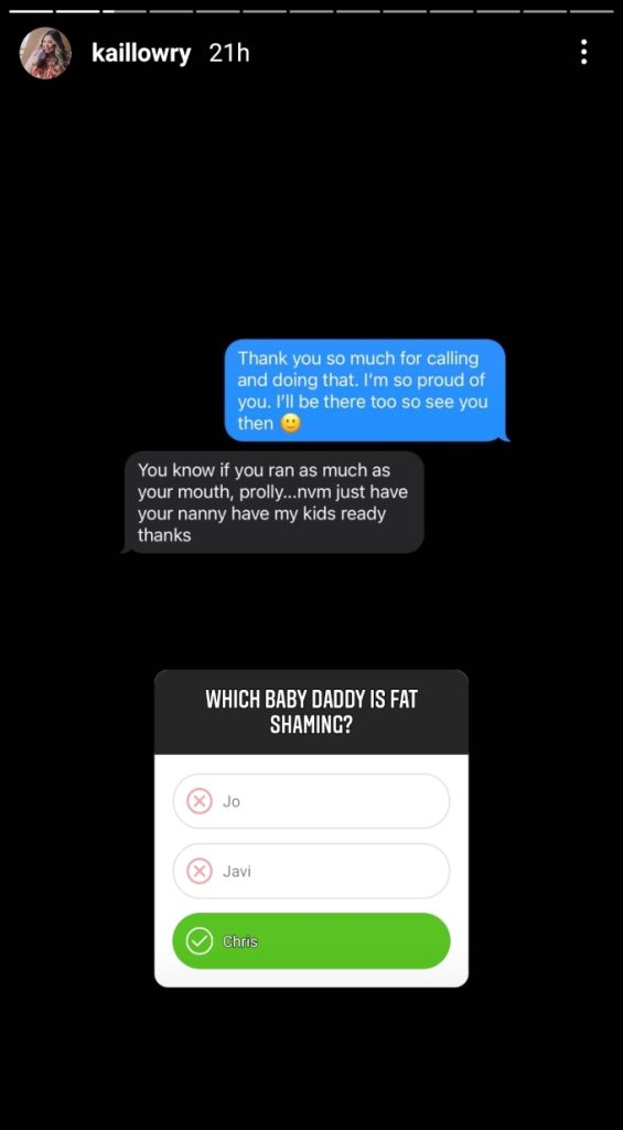 Kailyn shared the screenshot of her conversation with Chris where he fat-shamed her. She then polled the fans and asked which baby daddy is fat-shaming giving three options Jo Rivera, Javi Marroquin, and Chris Lopez.