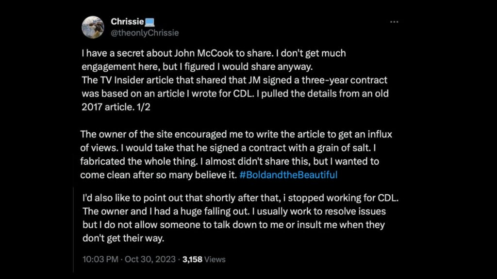 Adding fuel to the fire, Chrissie, a former writer for CDL, has revealed something surprising about John McCook’s contract news for The Bold and the Beautiful. Chrissie openly admitted that the news about McCook signing a three-year contract was an older news and does not stand true at this point. it was made up to attract more people to the website. Chrissie got this idea from an old 2017 article and used it to create a buzz. Even though not many people were paying attention to her, she decided to tell the truth to clear up the false story for those who believed it. After she confessed, she had a fight with the website’s owner and quit her job at CDL.