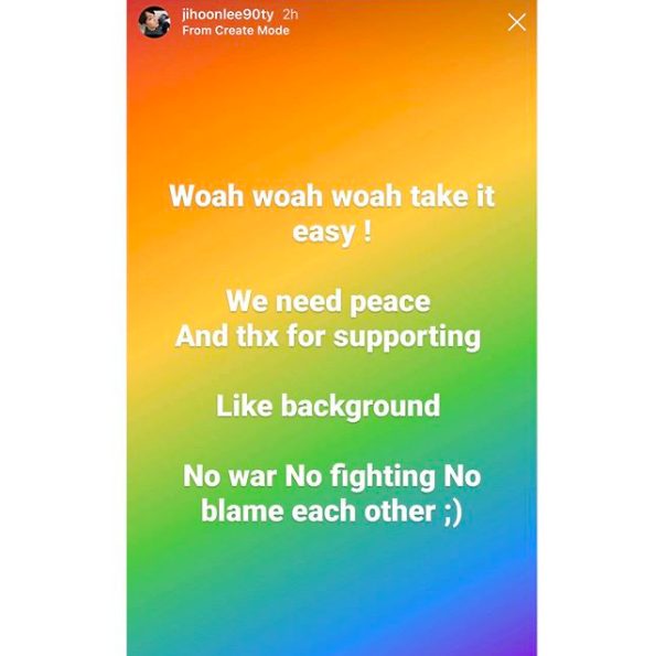 Even though he didn’t call out his estranged wife’s name, Jihoon told her to take it easy. He wrote the text on a rainbow background saying that we need peace instead of wars, fights, and blame games.