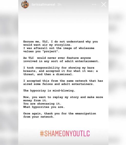 Throwing shade at TLC for projecting wholesome values, Larissa stated that she doesn’t understand why they wanted to feature her story line. She was surprised as TLC wouldn’t feature someone involved in adult entertainment. Larissa pointed out that she already took responsibility for showing her bare body and accepted the dismissal.