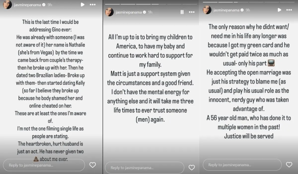 Then, in an Instagram post, Jasmine talked about a lot of things. She mostly exposed Gino and his dating history after their split. Then there was a moment where Jasmine said that Matt had been her support system and a really good friend, as “circumstances” would allow it. Lots of viewers were confused by this. They thought the couple would be together by now. But that doesn’t seem to be the case.