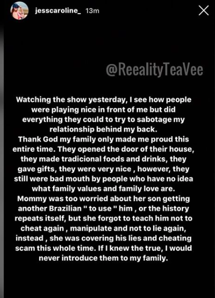 Jess is surprised at people bad mouthing her family even when they opened their doors for Colt and his mom, served traditional food and drinks, gave presents, and what not! It was obvious that Jess regretted ever introducing the mother-son duo to her family.