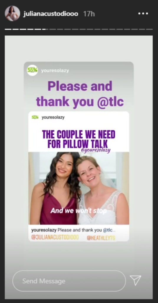 Fans have always loved the chemistry between Juliana and Sarah on 90 Day Fiance. One fan pointed out that it would be incredible if the two of them start together on the Pillow Talk. Certainly not a bad idea! Even Juliana responded by posting it on her Instagram stories. The post that said they are the couple fans need for Pillow Talk!