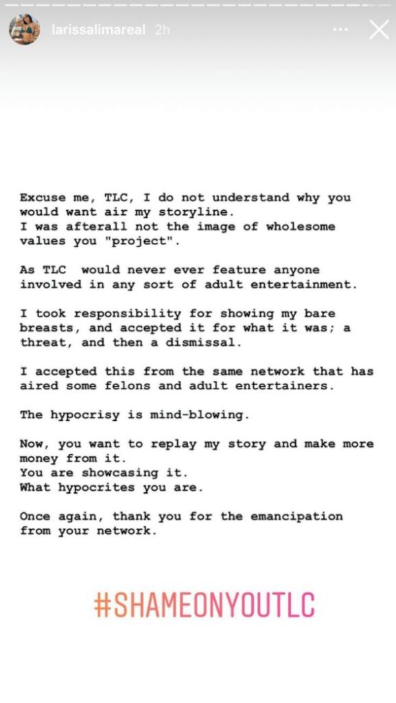 Larissa Lima took to her Instagram stories to rant over the whole matter. She began by writing that why would TLC air her storyline after firing her from the show. The 34-year-old star continued that TLC told her that it would not feature anyone associated with the adult entertainment. She shared that she showed her bare bosom and accepted it for whatever it was. Lima made a choice to get the Kardashian-inspired body and make money out of it. She went on to talk about how the network does air some adult entertainers.