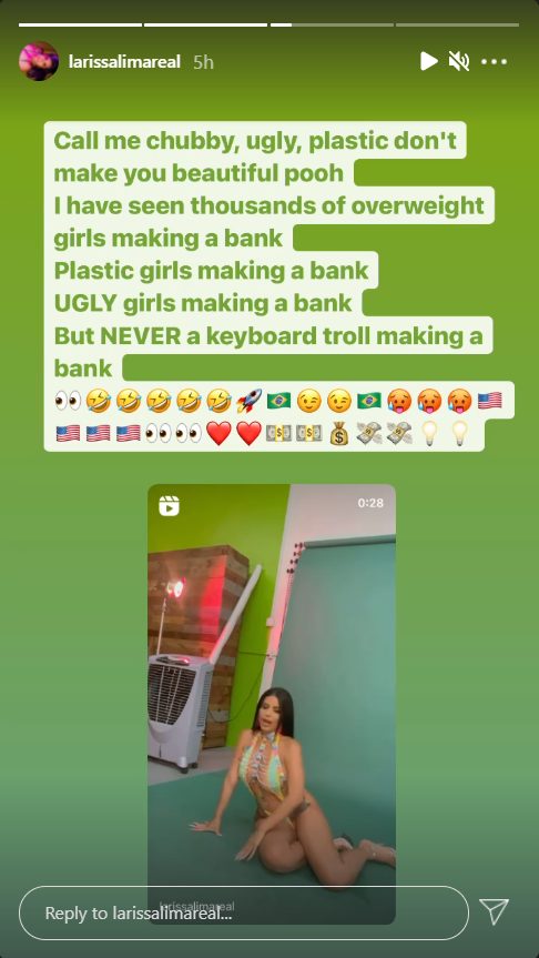 Larissa recently posted a video on Instagram showing BTS of her shoot. And many critics slammed the star in the comment section for her body. It seems that the star deleted most of the negativity, but she sure took a moment to address the situation. The star quoted a picture in her Instagram story as, “Call me chubby, ugly; plastic doesn’t make you beautiful pooh.” What matters the most to Larissa is her ability to make money. She added, “I have seen thousands of overweight girls making a bank, UGLY girls making a bank, But NEVER a keyboard troll making a bank.” Well, that’s true. Sitting and commenting ill on someone’s photo will not make you rich.