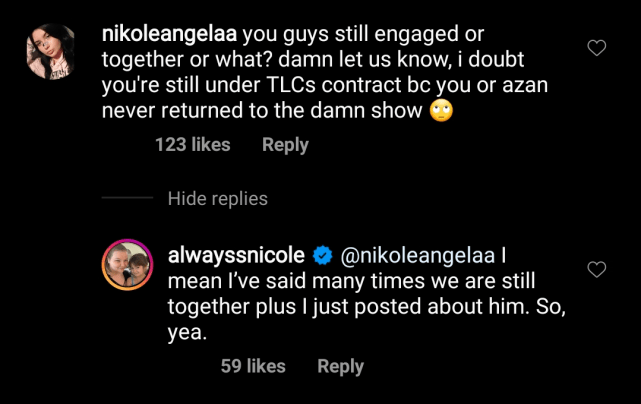 With a rolling eyes emoji, a fan expressed her curiosity over Nicole and Azan’s relationship status. Fans are also wondering whether Nicole is under an NDA with TLC. But it looks like the former reality TV alum didn’t like any pointing fingers in her and Azan’s direction. She pointed out that she posted about him recently and is pretty active about updating fans on their relationship status. She also pointed out that in her bio, she has already specified that she is engaged.
