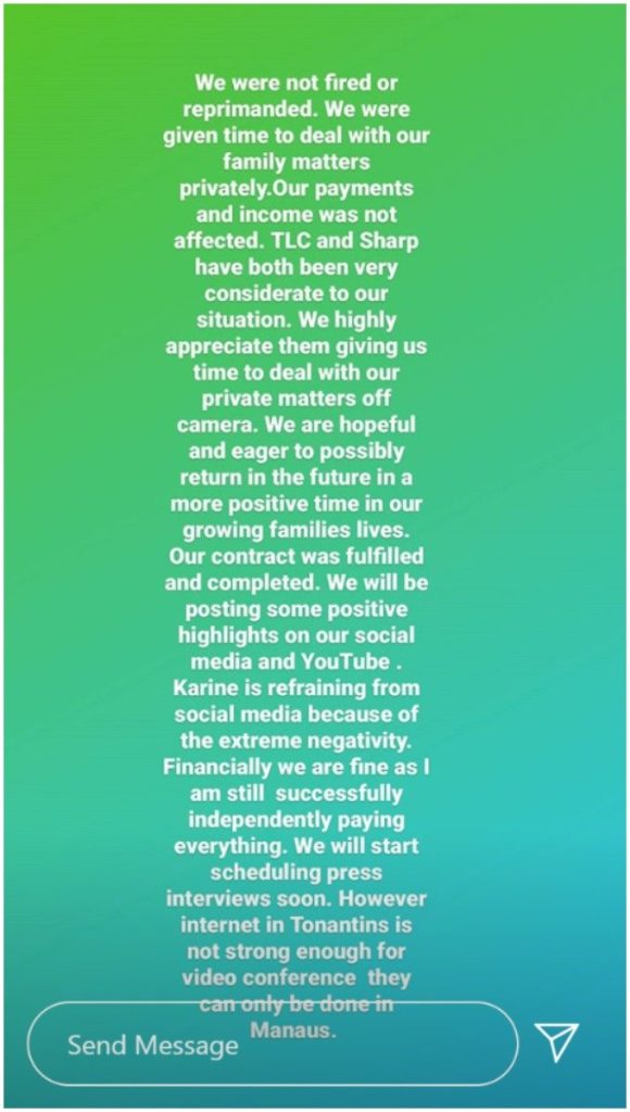During the past weekend, Paul issued an official statement to explain his stand on the rumors of being fired from the show. He wrote in his Instagram stories that he and Karine were not fired from the show. He continued that neither of them faced reprimand or anything of that sort. They received their incomes and payments and, most importantly, time. Paul explained that the network gave them time to handle their issues privately away from the cameras. He is ever so grateful to TLC and Sharp for this.