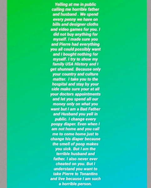 He thought that Karine yelling at him in public was totally inappropriate considering that all his money goes for bills and buying her designer clothes. He also stated that there was nothing he bought for himself while making sure that she and their son have enough.