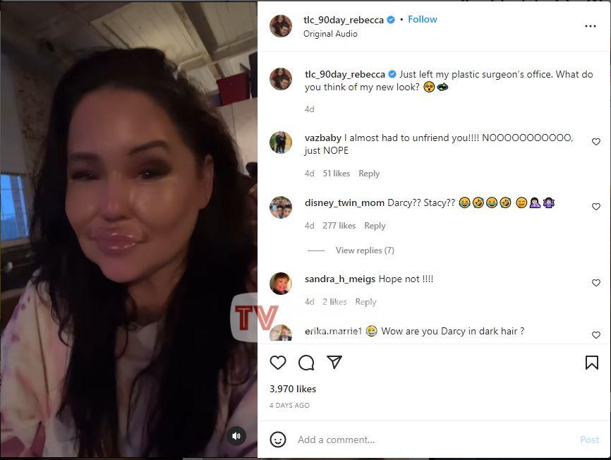 Speaking of transformations, this isn’t the first time Rebecca has gone through one. A while ago, she put up a post with a heavy filter. Although she did it for the laughs, it heavily changed Rebecca’s face and made it more structured and her lips fuller. Since it wasn’t a real makeover, Rebecca was trying to mock the people who seek surgeries and change their faces. As a result, viewers began to notice an uncanny resemblance between her with another 90 Day Fiance star.