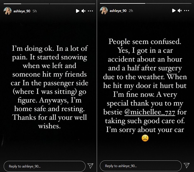 Anyway, she assured her followers that she is resting at home. Later she posted another story about people being confused. She further clarified that the car accident occurred one and a half hours after surgery because of the weather. She was hurt when the other vehicle hit her door but afterward, she was okay. Ashley thanked her friend for taking such good care of her and was sorry about her car.
