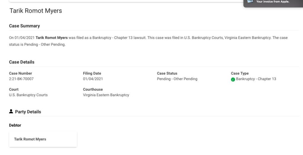 It’s not the first time Tarik has filed for bankruptcy. He did the same thing in October 2008 and March 2009. A judge dismissed the second filing. Now, after filing for Chapter 13, he has to make his first filing Chapter 7. Let us know what you think of Tarik’s questionable financial habits in the comments below.