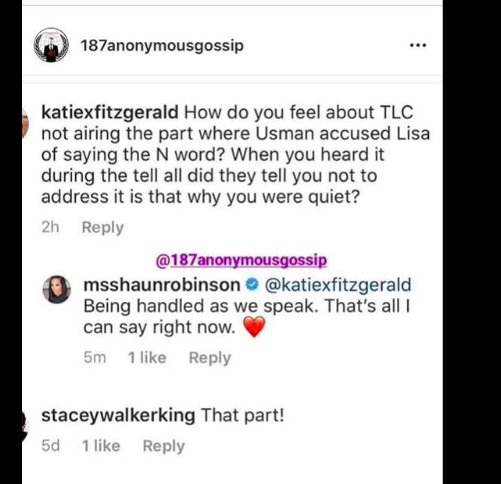 Fans have been wondering why TLC has not aired the part where Lisa called Usman that word. Shaun replied to the comment and stated that it is being handled as they speak with a heart emoji. Another fan added that Shaun was definitely not wrong when she said that they were handling it. Of course, that came after the rumor that TLC fired Usman and Lisa.