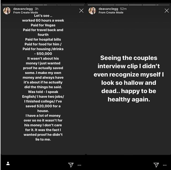 Deavan took to her Instagram stories to let fans know how much she has been working and the expenses she had been bearing all this time. The 90 Day Fiance: The Other Way star indicated that she used to work 60 hours a week and was the one paying for traveling back and forth all the time.