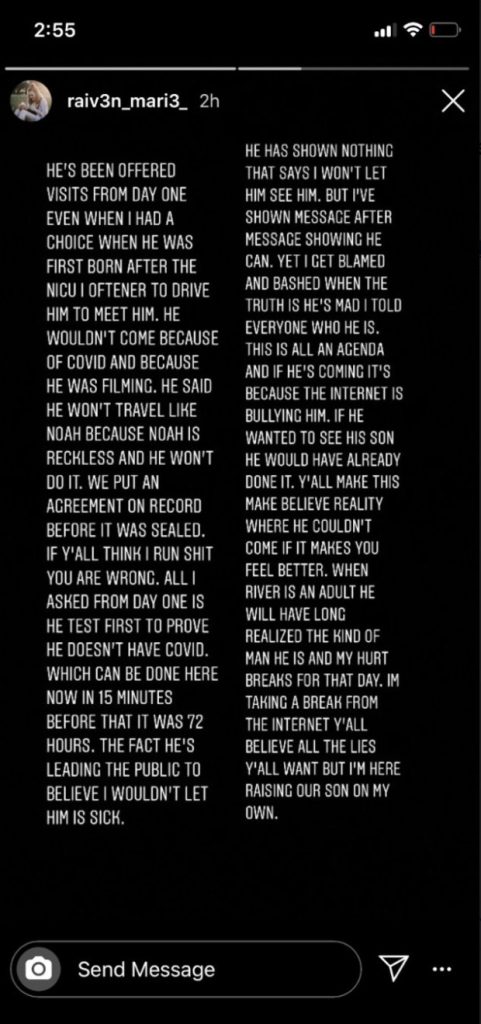 Raiven and Bear are crossing each other’s statements which looks like they might not be amicable about co-parenting. In fact, she revealed that he is not willing to co-parent the child and she has never prevented the boy from meeting his dad.