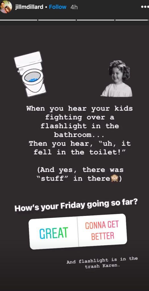 According to InTouch Weekly, Jill shared an Instagram story on Friday explaining her sons fighting over a flashlight in the bathroom. The flashlight eventually fell into the toilet. She also teased that there was ‘stuff’ in there. With this, she added a toilet image and GIF of Shirley Temple laughing, asking her fans about their plans for Friday. Well, this was not it. The reality star further added a note, in the end, shutting the Karens. She shared that the flashlight is now in the trash.