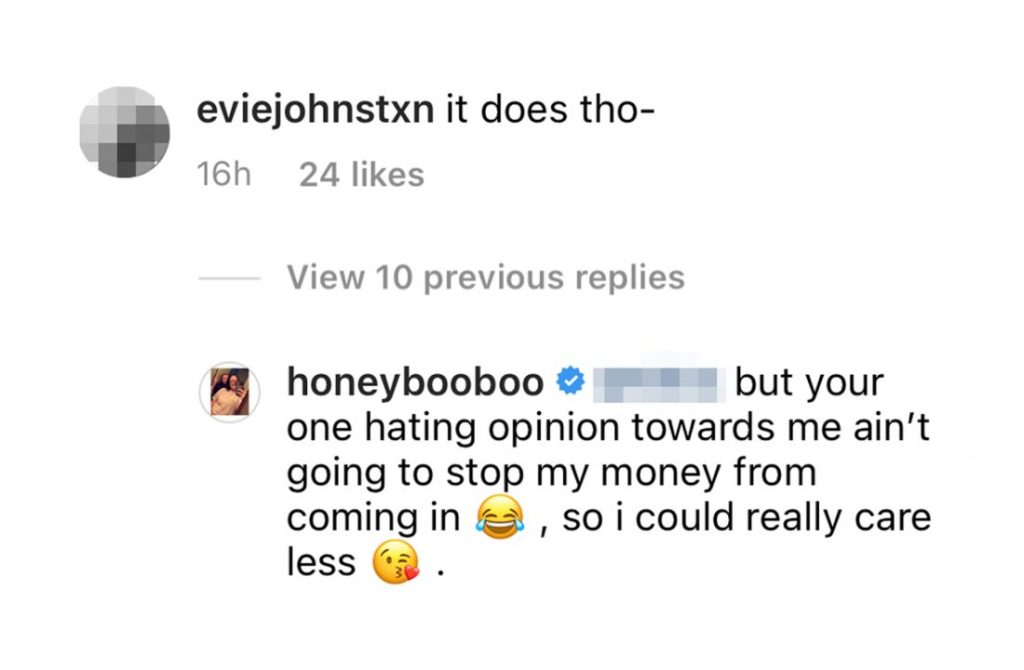 A fan jumped into the comments section and wrote that ‘It does tho…’ Well, Alana did turn off the comments for this post but clapped back at this particular commenter before doing so. She shot back, saying that she makes money regardless of the fact that people like her or not. In the follow-up comments, the followers discussed how the stars continue to make money. In a separate comment, Honey Boo Boo also added that ‘But your one hating opinion toward me ain’t going to stop my money from coming in, so I could really care less [kissing face emoji.’