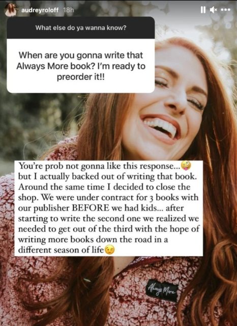 Audrey, 29, and her husband Jeremy Roloff, 30, recently promoted their second book on Instagram. And fans were expecting the couple to reveal their third one soon. Many were eagerly waiting to read Audrey’s third book and know more about it. One of the fans even asked Audrey, “When are you going to write that Always More Book? I’m ready to preorder it.”