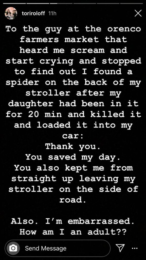 When she found the spider, Tori started screaming. Not to mention, she broke down thinking about what could have happened considering that it was in the stroller for 20 minutes and Lilah was in it. But a guy heard her scream and killed the spider. He also loaded the stroller into her car.
