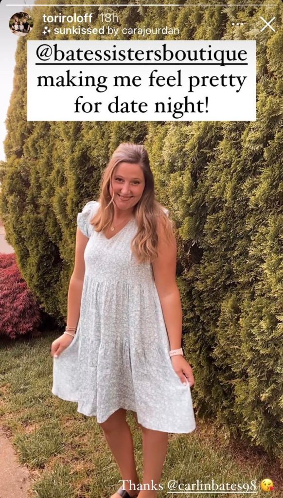 Tori Roloff does not leave anyone behind. She now chose to go on a date with Zach. Therefore, the star dressed all up floral and flowy. On Wednesday, April 28, she took it to Instagram to flaunt her beautiful dress. Moreover, Tori also provided credit to Bringing Up Bates’ star Carlin Bates. Tori Roloff posted the photo in her Instagram story, saying, “@batessistersboutique making me feel pretty for date night!”