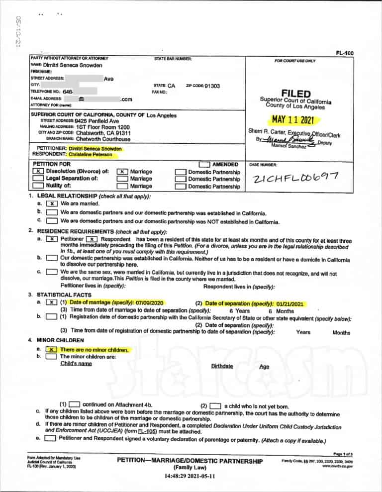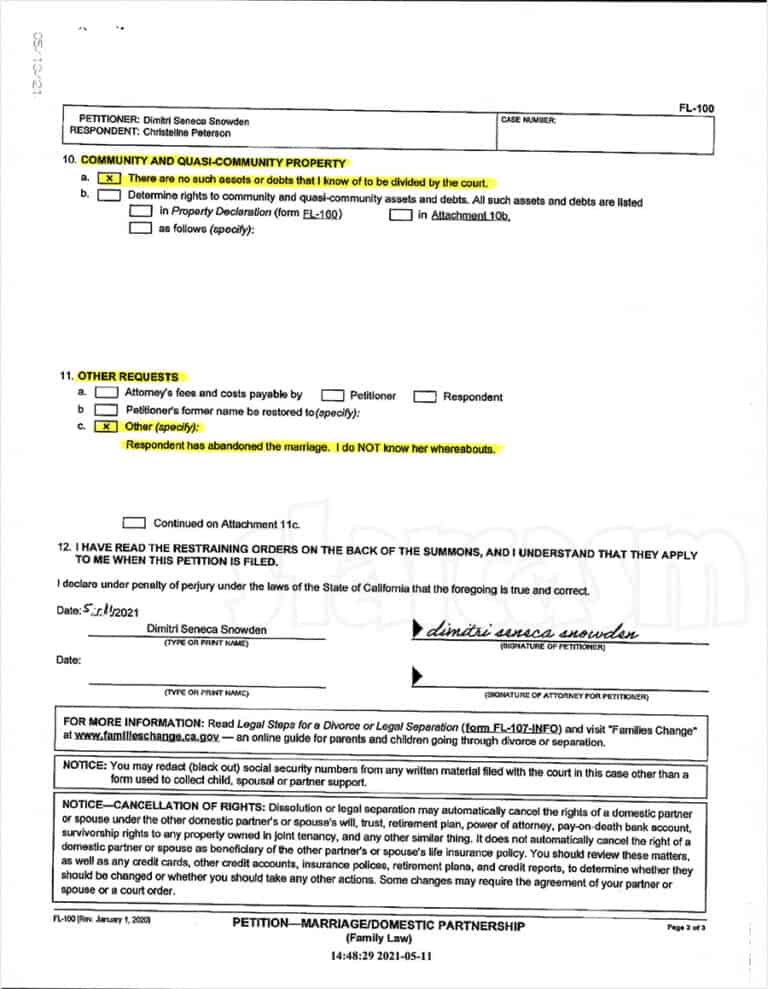 The records claim that the two don’t have any children. Moreover, Petitioner requests divorce on irreconcilable differences. Dimitri ticks on the section which says ‘terminate the court’s ability to reward support to Respondent (Christeline)’ from spousal or domestic support. The couple does not have any assets, debts, or property together, which is to be divided by the court. Dimitri Snowden says in the official paper that the Respondent, Christeline, was the one to abandon the marriage. He further claims to “not know about her whereabouts.” As per divorce papers, Dimitri had nothing else to claim rather than the divorce.